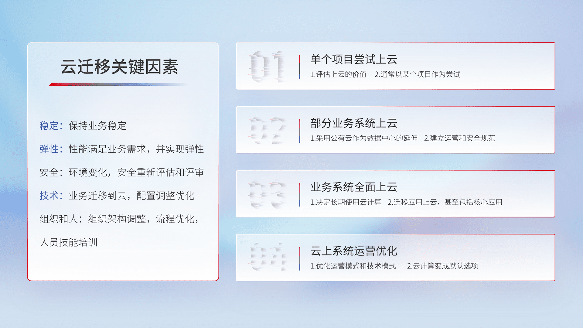 结合实际业务,,,从规划设计、、、云平台选型、、、、云原生改造、、、、数据迁移、、、、集成交付,,,迁移全过程为客户识别最佳上云路径,,做好风险识别管理,,,设计网络架构、、、身份权限、、安全审计合规、、、、操作审计、、日志审计、、、、监控告警策略、、、多站点容灾设计等,,对云上基础设施进行整体规划,,,,提升IT治理水平,,,,以满足弹性、、高可用、、、、高性能的需求。。