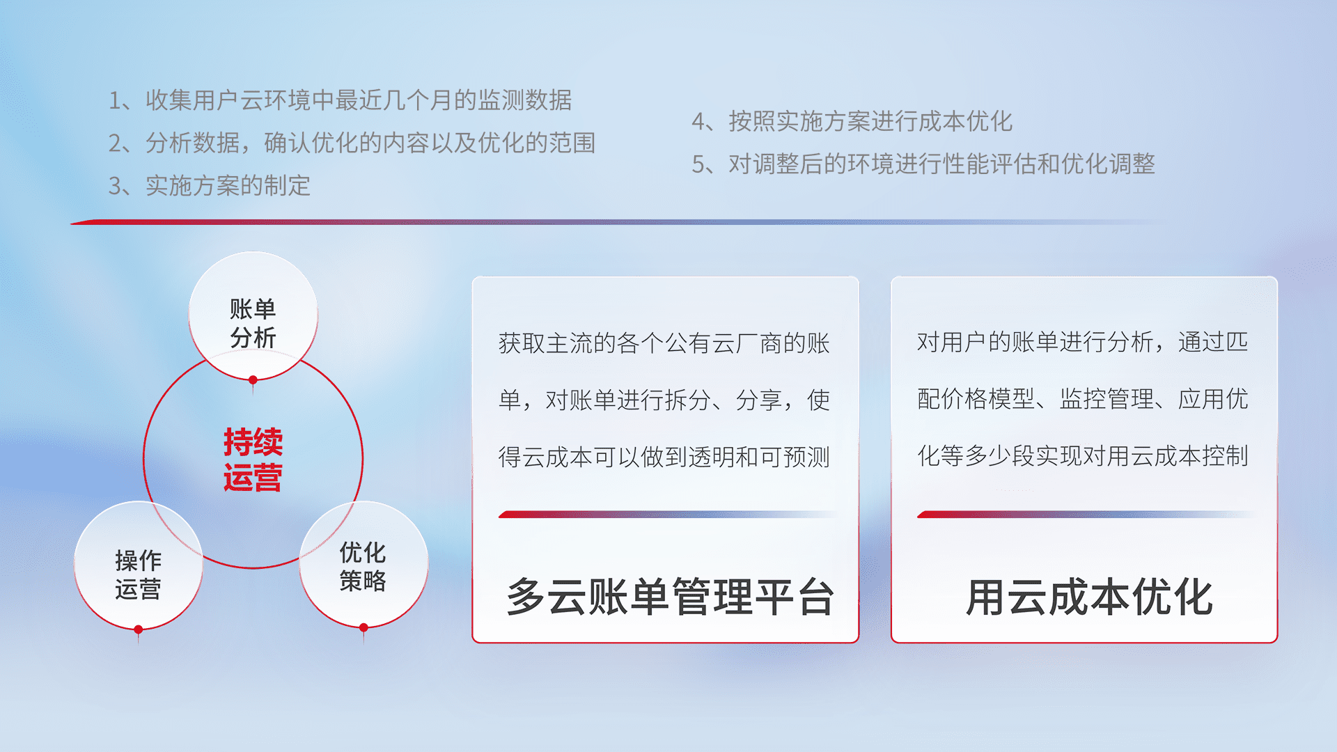 通过多云纳管,,,,以统一的资源数据模型把客户的云资源进行抽象和封装,,进而实现对多云资源的统一操作,,保障云资源管理的可靠性、、稳定性与可用性。。。。量身定制化运维内容,,,,配置、、、、开发运维、、补丁管理、、、备份、、监控、、、认证和访问管理、、、审计和日常巡检等,,,,保障在用云过程中的可靠度,,,,稳定度以及高可用率。。。。